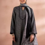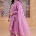 The delicate charm of winter in this soft pink three-piece suit, designed to blend intricate craftsmanship with timeless grace. The long straight cambric shirt features a round neckline adorned with exquisite embroidery along the front, hem, and sleeves, delicately enhanced with lace accents for a feminine touch. Paired with flowing flared trousers and a complementary khaddi dupatta, this ensemble offers a harmonious balance of tradition and modernity, perfect for festive celebrations, weddings, or special occasions.